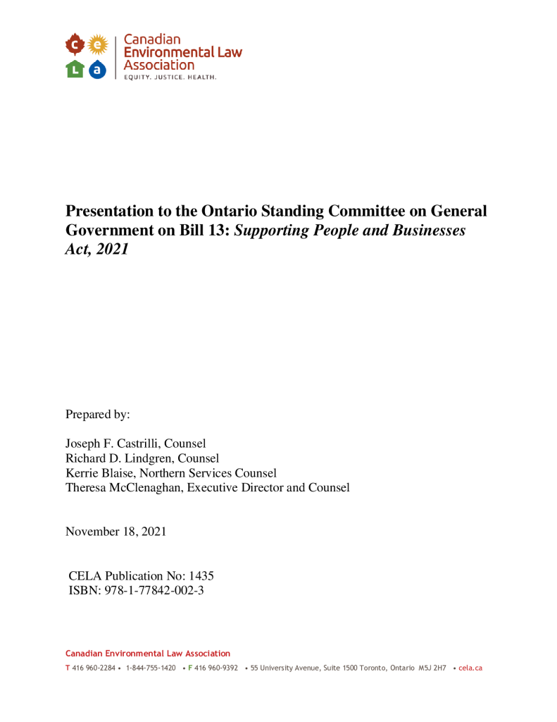 Submission Re: Bill 13: Supporting People and Businesses Act, 2021