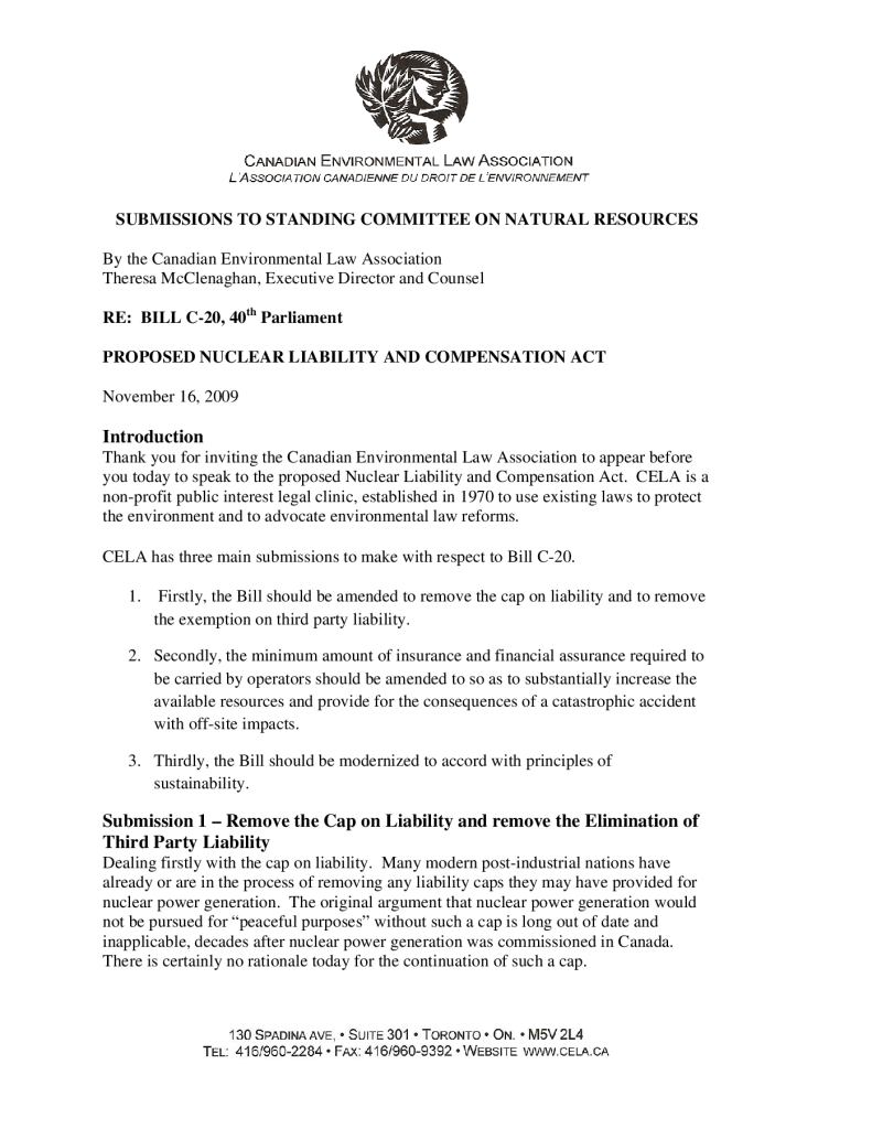 Submission re: Bill C-20 proposed Nuclear Liability and Compensation Act