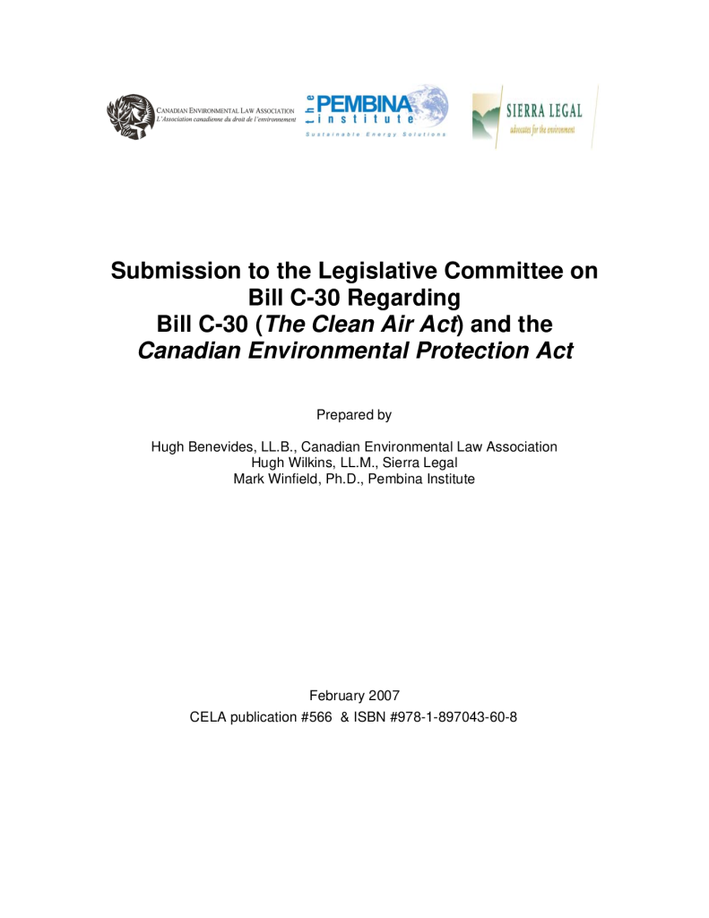 Submission the the Legislative Committee on Bill C-30 regarding Bill C-30 (The Clean Air Act) and the Canadian Environmental Protection Act