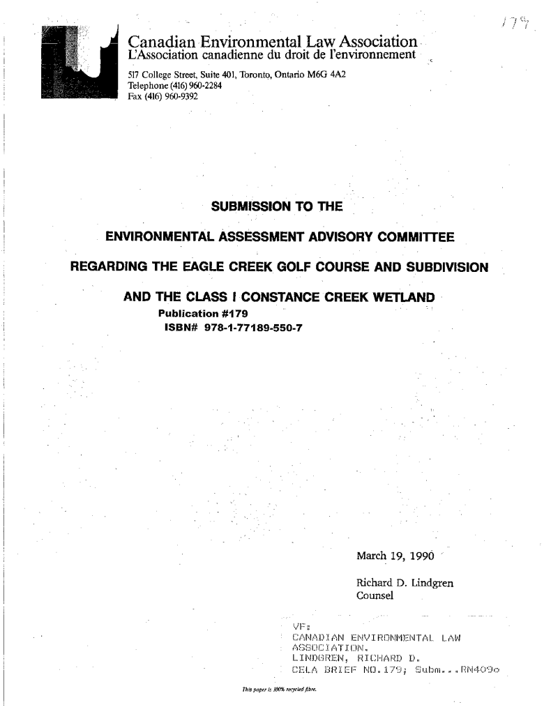 Submission to the Environmental Assessment Advisory Committee regarding the Eagle Creek golf course and subdivision and the Class I Constance Creek wetland