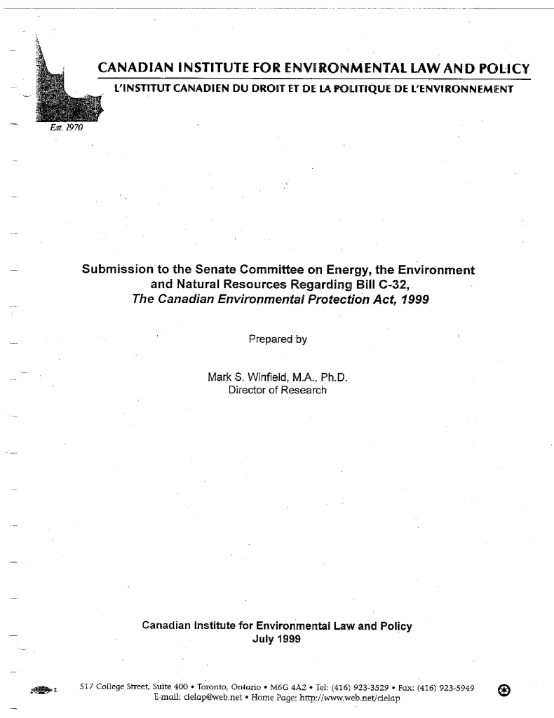 Submission to the senate committee on energy, the environment and natural resources regarding bill C-32, the Canadian Environmental Protection Act, 1999