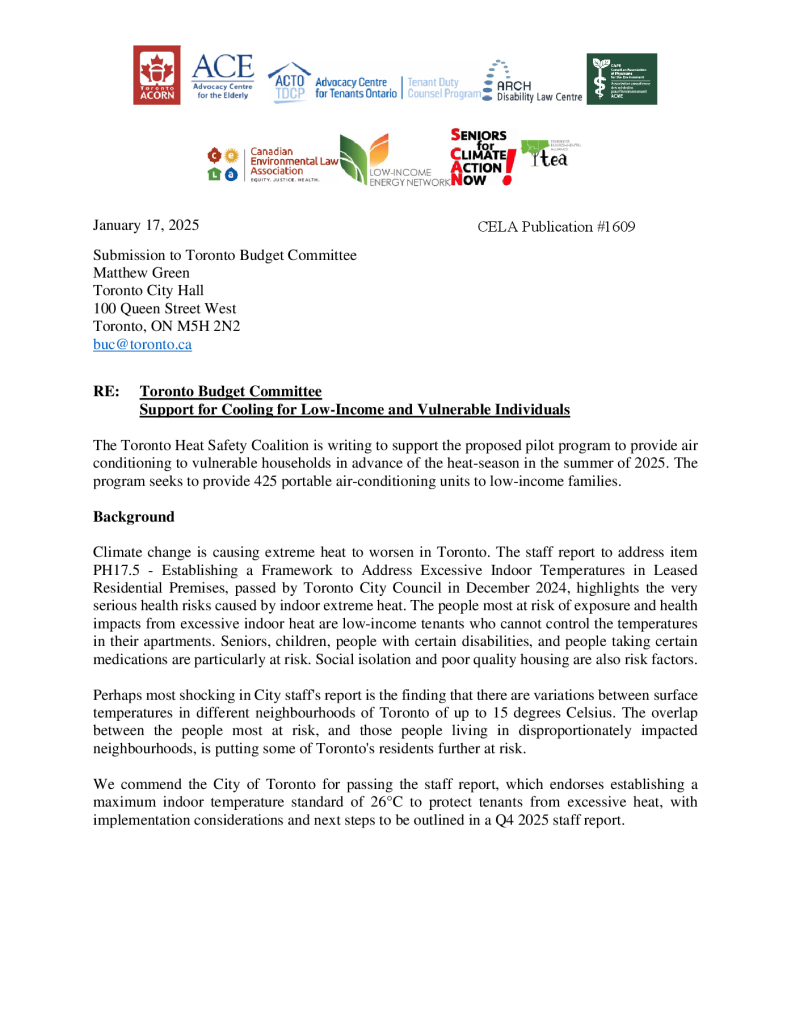 Submission to Toronto Budget Committee, Support for Cooling for Low-Income and Vulnerable Individuals