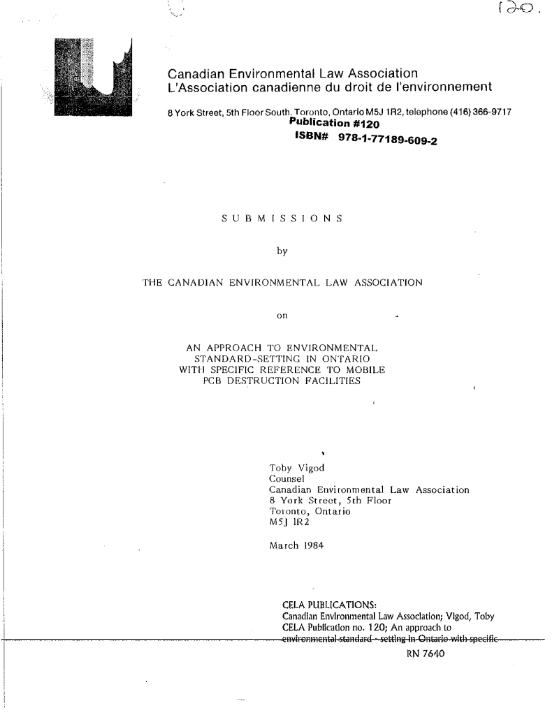 Submissions by the Canadian Environmental Law Association on an approach to environmental standard-setting in Ontario with specific reference to mobile PCB destruction facilities