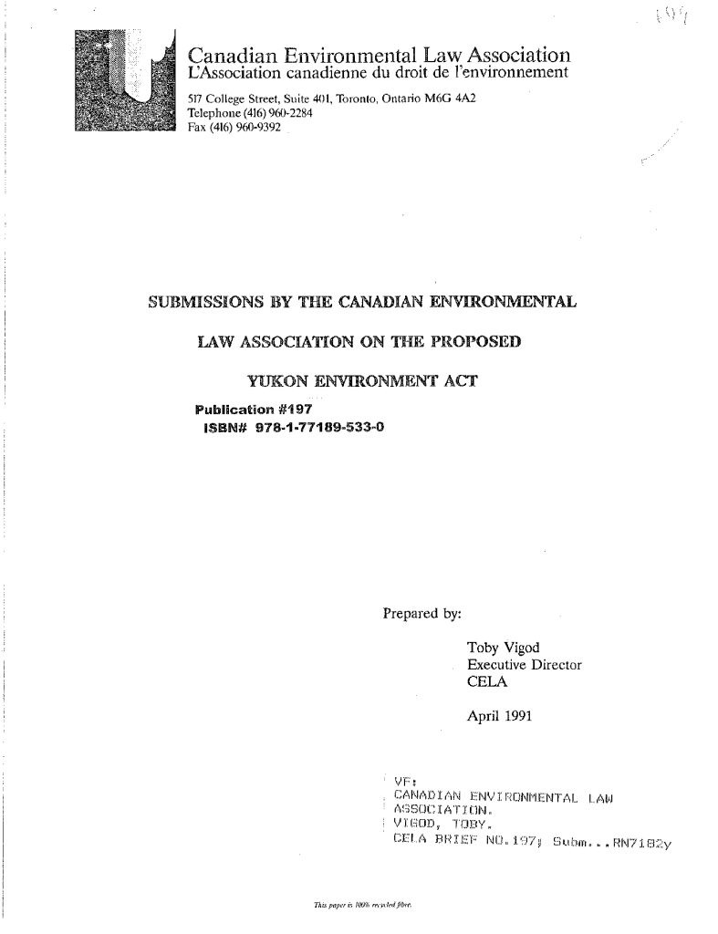 Submissions by the Canadian Environmental Law Association on the proposed Yukon environment act