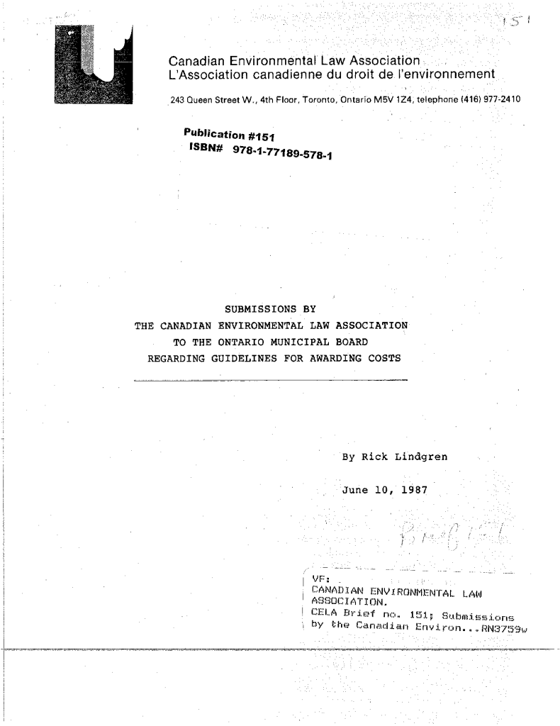 Submissions by the Canadian Environmental Law Association to the Ontario Municipal Board regarding guidelines for awarding costs