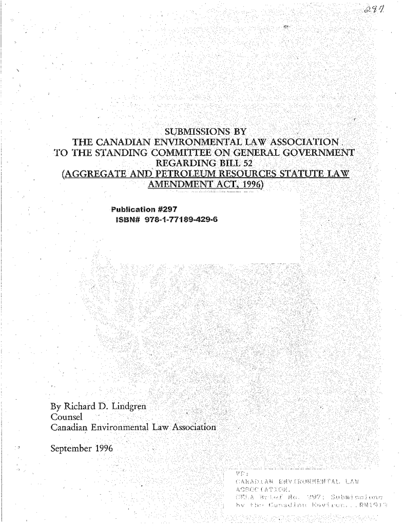 Submissions by the Canadian Environmental Law Association to the Standing Committee on General Government regarding Bill 52 (Aggregate and petroleum resources statute law amendment act, 1996)