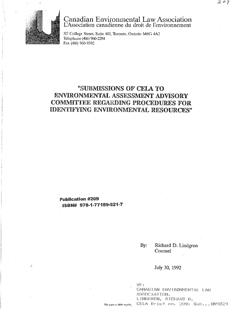 Submissions of CELA to Environmental Assessment Advisory Committee regarding procedures for identifying environmental resources