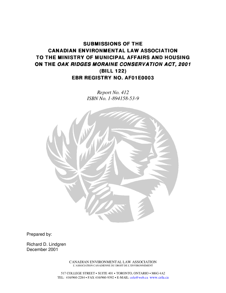 Submissions of the Canadian Environmental Law Association to the Ministry of Municipal Affairs and Housing on the Oak Ridges Moraine Conservation Act, 2001 (Bill 122), EBR Registry no. AF01E0003