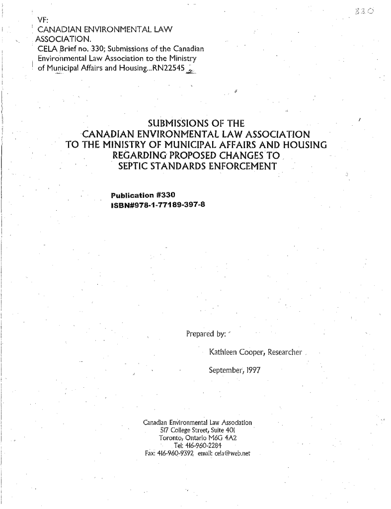 Submissions of the Canadian Environmental Law Association to the Ministry of Municipal Affairs and Housing regarding proposed changes to septic standards enforcement