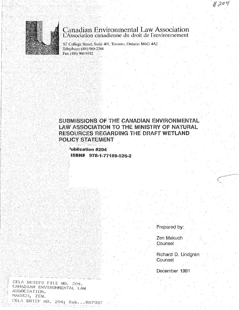 Submissions of the Canadian Environmental Law Association to the Ministry of Natural Resources regarding the draft wetland policy statement
