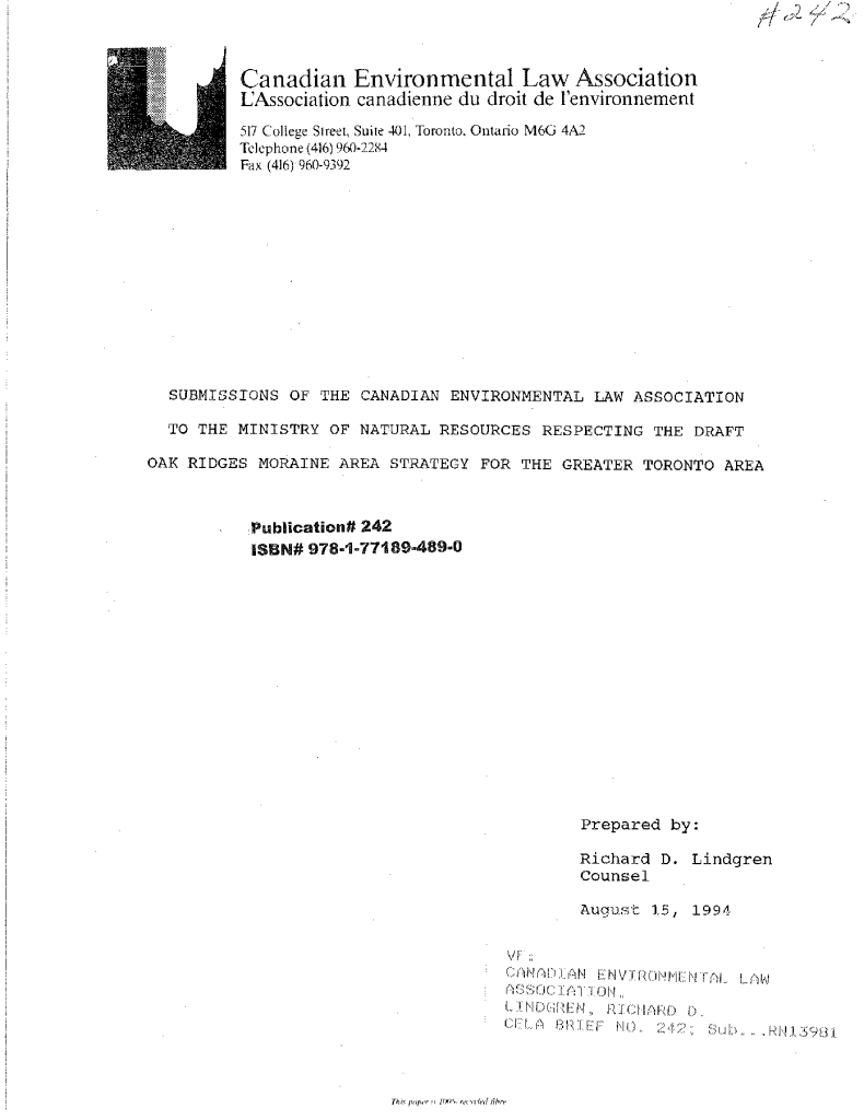 Submissions of the Canadian Environmental Law Association to the Ministry of Natural Resources respecting the draft Oak Ridges Moraine area strategy for the Greater Toronto Area