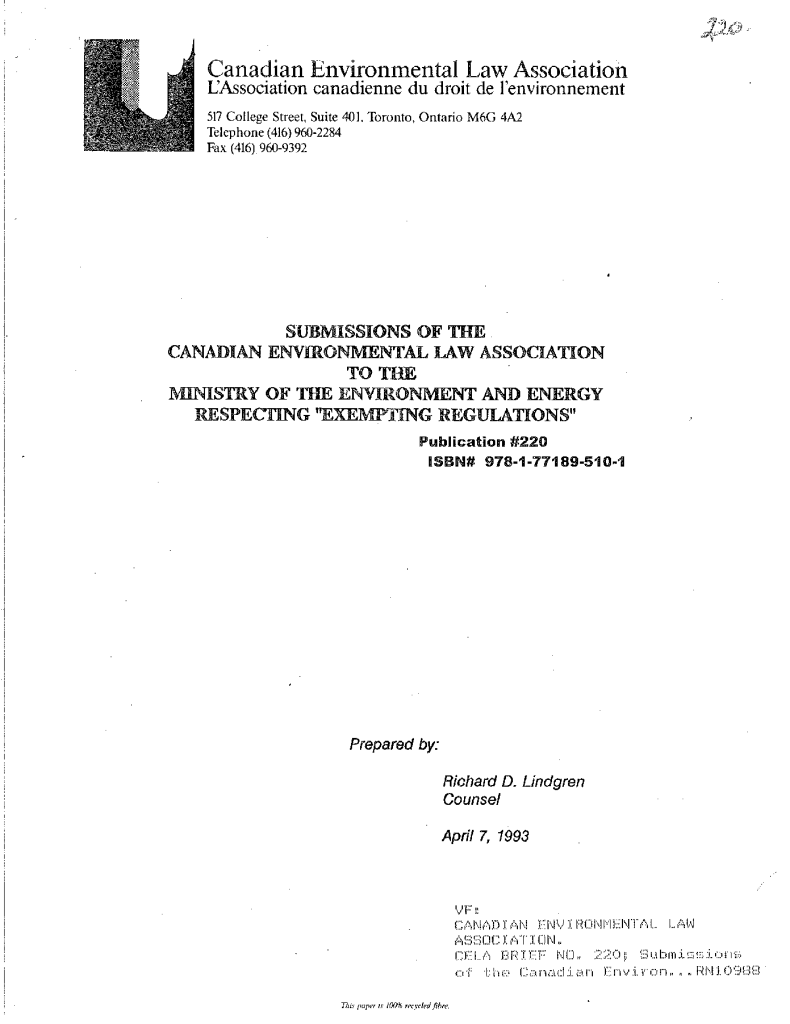 Submissions of the Canadian Environmental Law Association to the Ministry of the Environment and Energy respecting “Exempting Regulations”