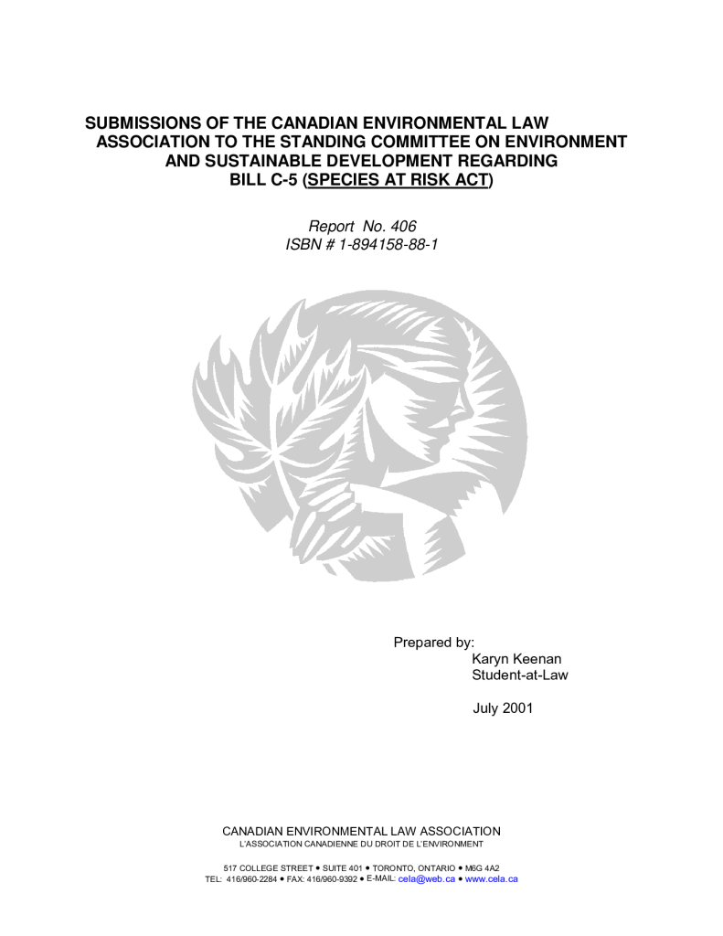 Submissions of the Canadian Environmental Law Association to the Standing Committee on Environment and Sustainable Development regarding Bill C-5 (Species at Risk Act)