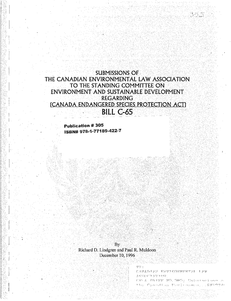Submissions of the Canadian Environmental law Association to the Standing Committee on Environment and Sustainable Development regarding Bill C-65 (Canada Endangered Species Protection Act)