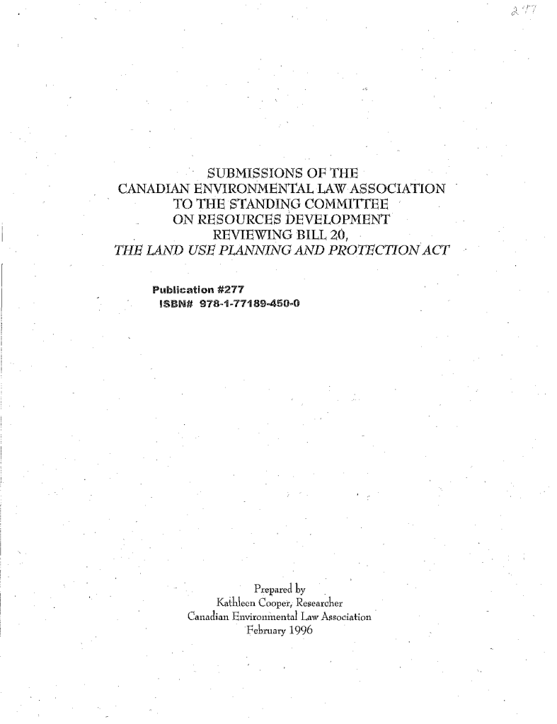 Submissions of the Canadian Environmental law Association to the Standing Committee on Resources Development review Bill 20, The Land Use Planning and Protection Act