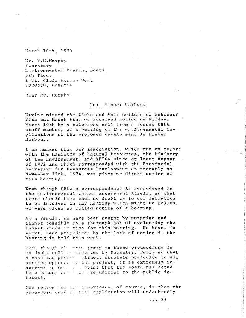 Submissions of the CELA to Environmental Hearing Board re: Fisher Harbour Development