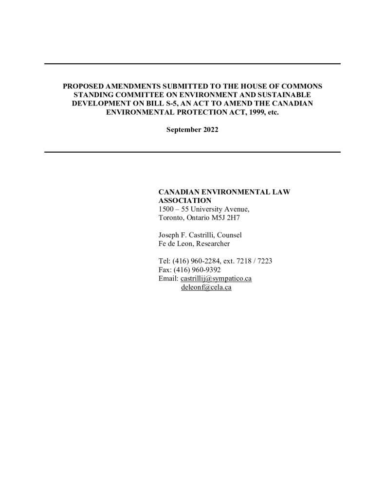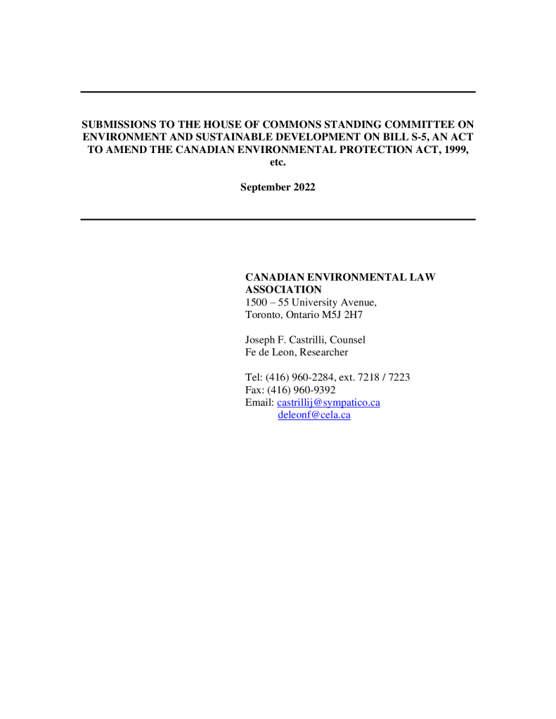 Submissions on Bill S-5, An Act to Amend the Canadian Environmental Protection Act