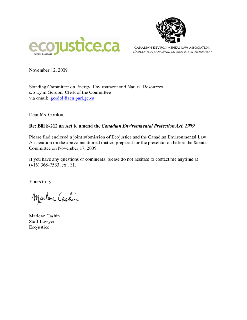 Submissions re: Bill S-212 an Act to amend the Canadian Environmental Protection Act, 1999
