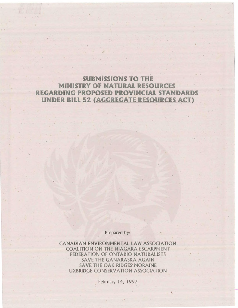 Submissions to the ministry of natural resources regarding proposed provincial standards under Bill 52 (aggregate resources act)