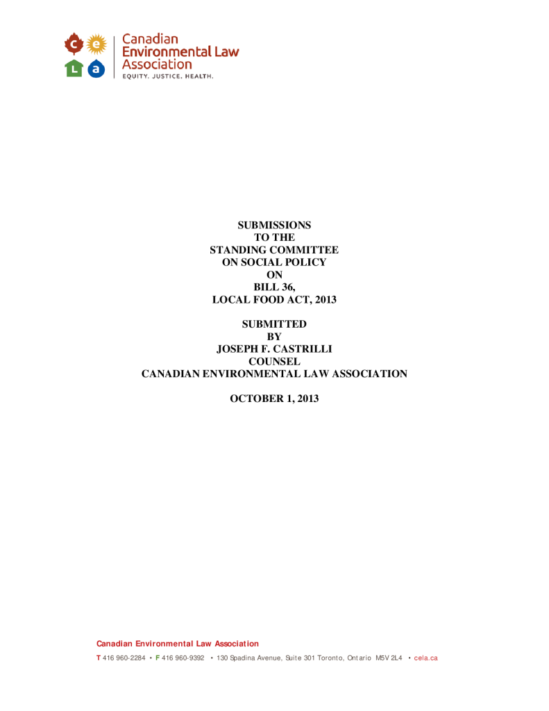 Submissions to the Standing Committee on Social Policy on Bill 36, Local Food Act, 2013