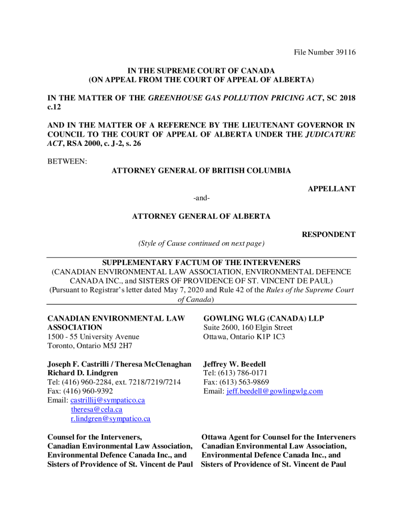 Supplementary Factum of the Intervenors filed in the Supreme Court of Canada – federal role in carbon pricing