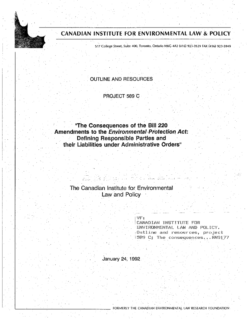 The consequences of bill 220 Amendments to the Environmental Protection Act: defining responsible parties and their liabilities under administrative orders.