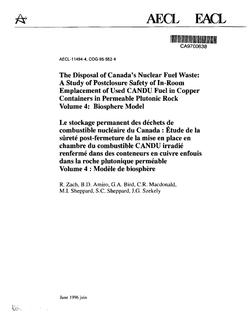 The disposal of Canada’s nuclear fuel waste : a study of postclosure safety of in-room emplacement of used CANDU fuel in copper containers in permeable plutonic rock volume 4: biosphere model