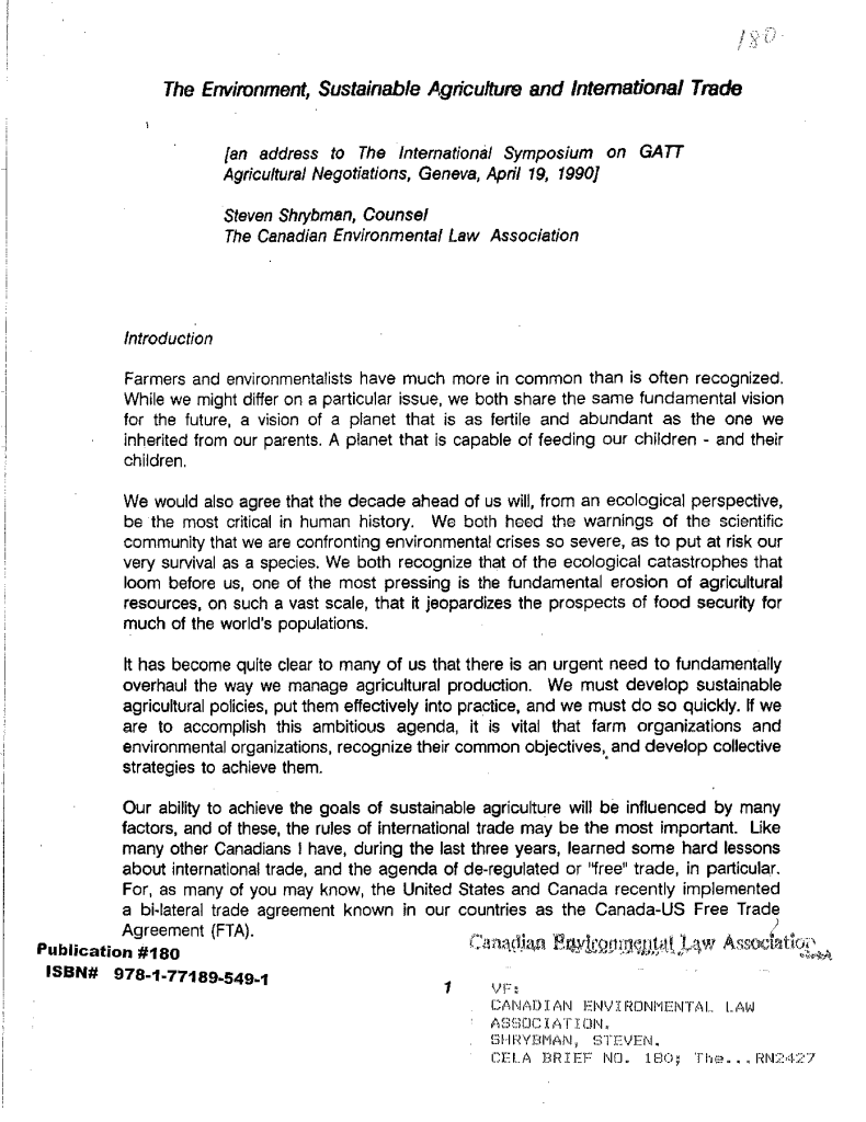 File 1.0 - CELA briefs and responses to government consultations trade and the environment
