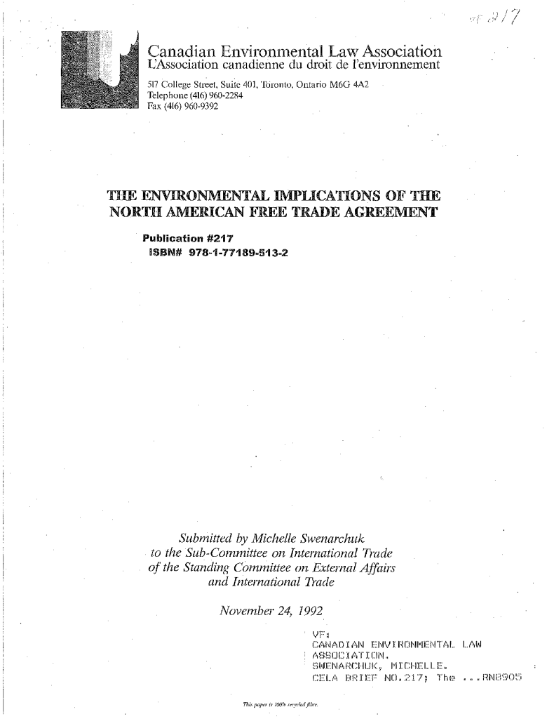 File 1.0 - CELA briefs and responses to government consultations trade and the environment