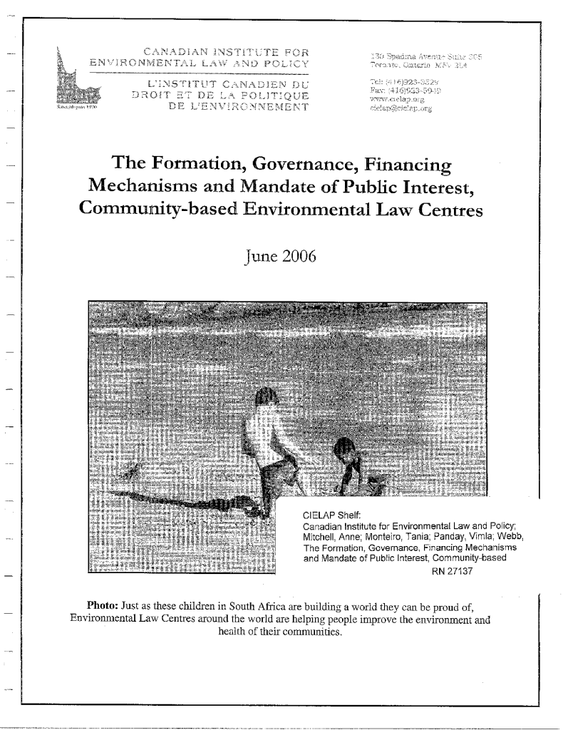 The formation, governance, financing mechanisms and mandate of public interest, community-based environmental law centres