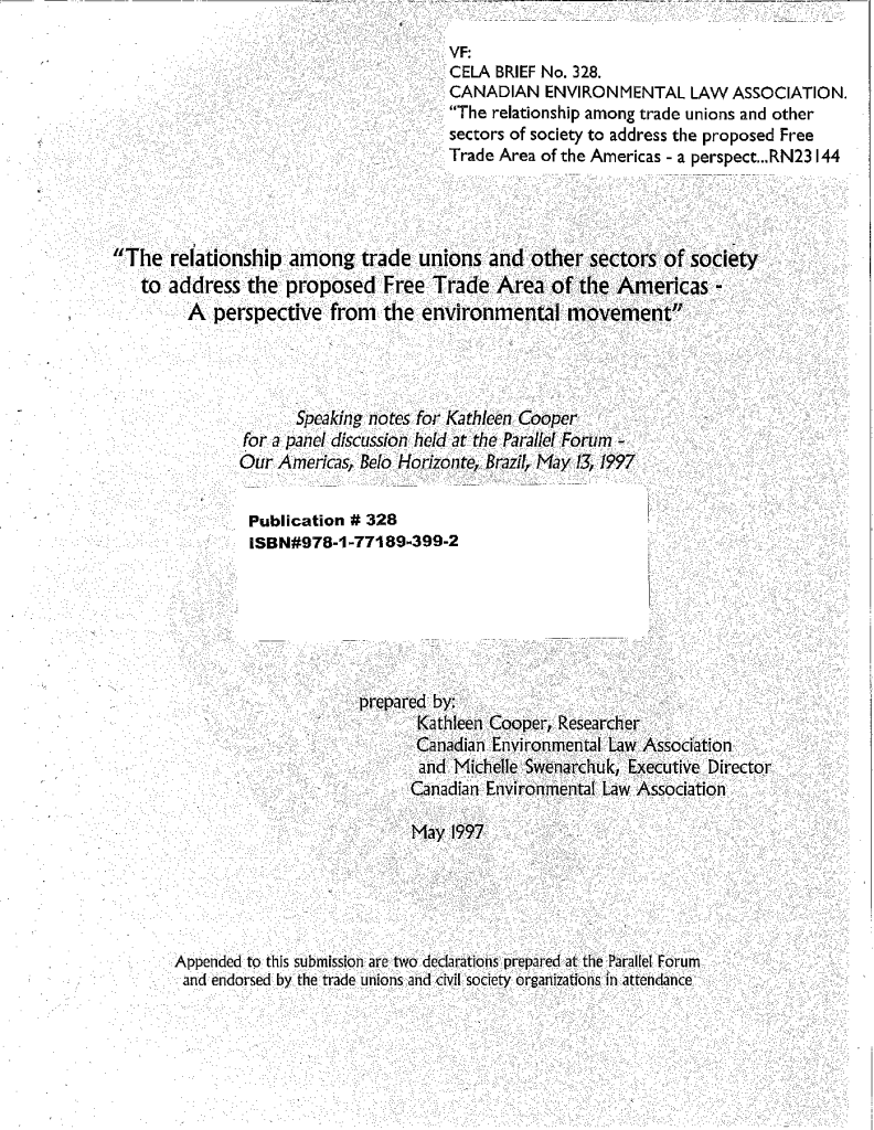 The relationship among trade unions and other sectors of society to address the proposed Free Trade Area of the Americas- A perspective from the environmental movement