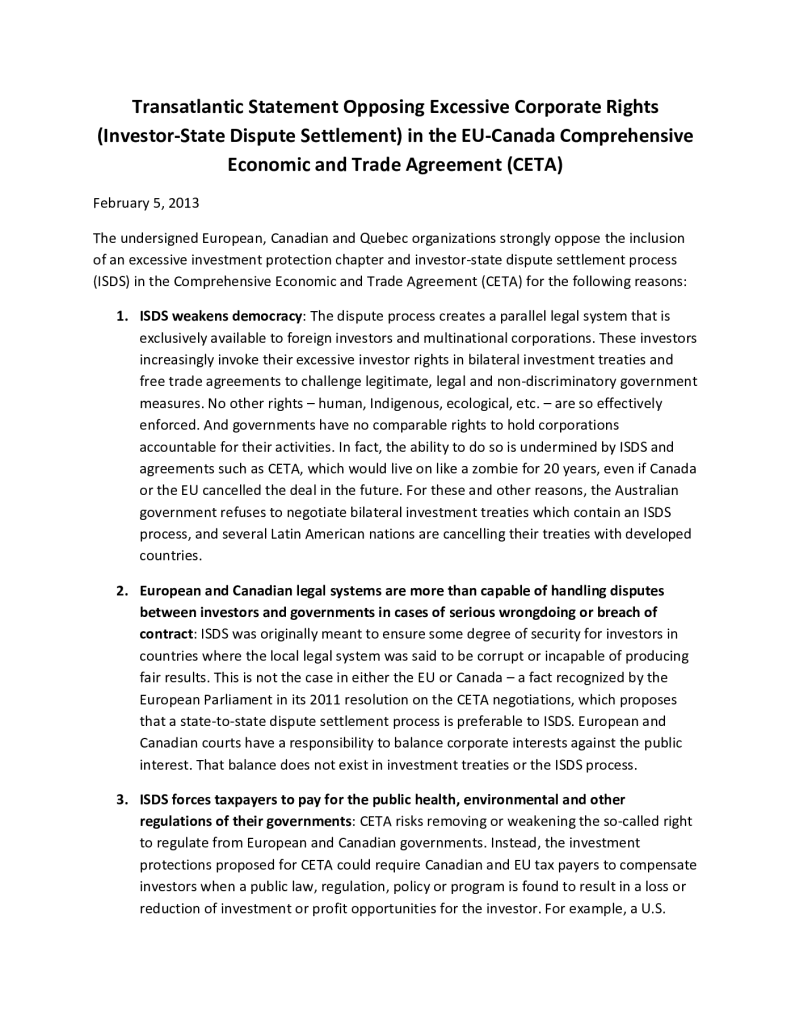 Transatlantic Statement Opposing Excessive Corporate Rights (Investor-State Dispute Settlement) in the EU-Canada Comprehensive Economic and Trade Agreement (CETA)