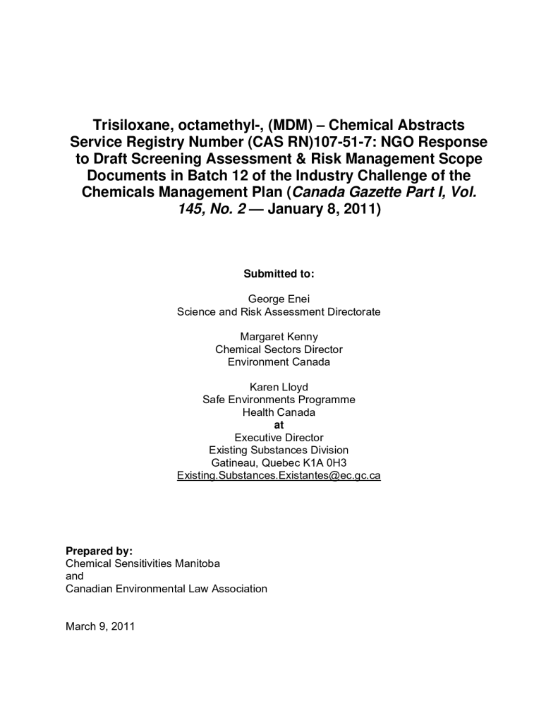 Trisiloxane, octamethyl-, (MDM)- Chemical Abstracts Service Registry Number (CAS RN) 107-51-7: NGO response to draft screening assessment and risk management scope documents in Batch 12 of the Industry Challenge of the Chemicals Management Plan (Canada Gazette Part I, Vol. 145, No. 2, January 8, 2011)