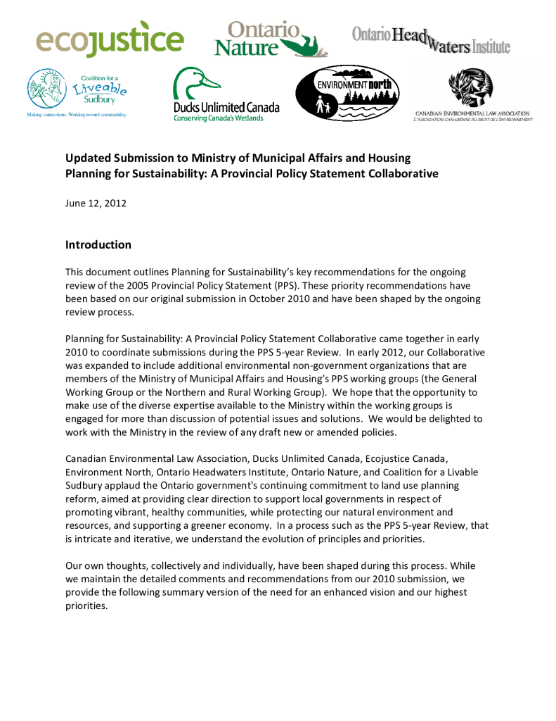 Updated Submission to Ministry of Municipal Affairs and Housing Planning for Sustainability: A Provincial Policy Statement Collaborative