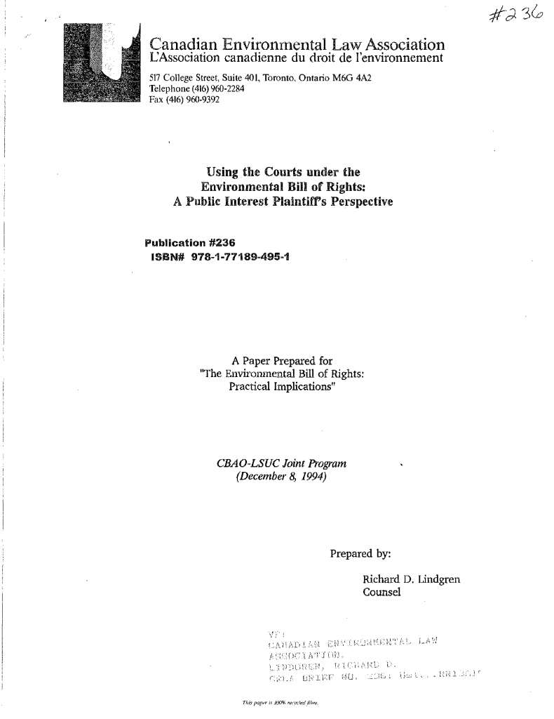 Using the courts under the environmental bill of rights: a public interest plaintiff’s perspective