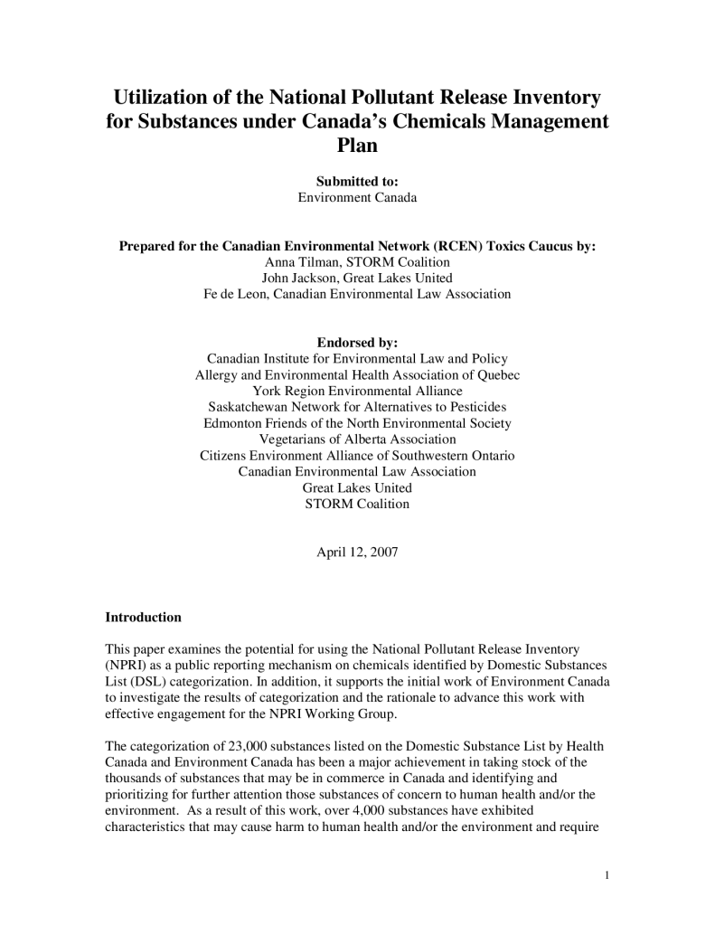 Utilization of the National Pollutant Release Inventory for substances under Canada’s Chemicals Management Plan