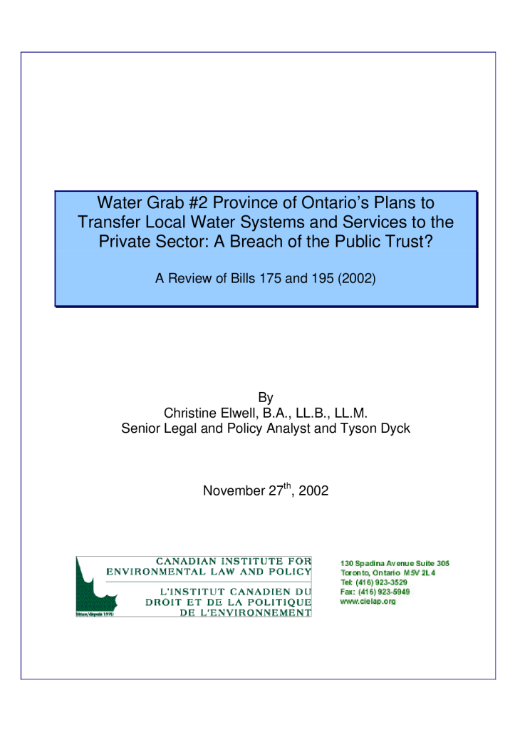 Water grab #2 province of Ontario’s plans to transfer local water systems and services to the private sector: A breach of the public trust?