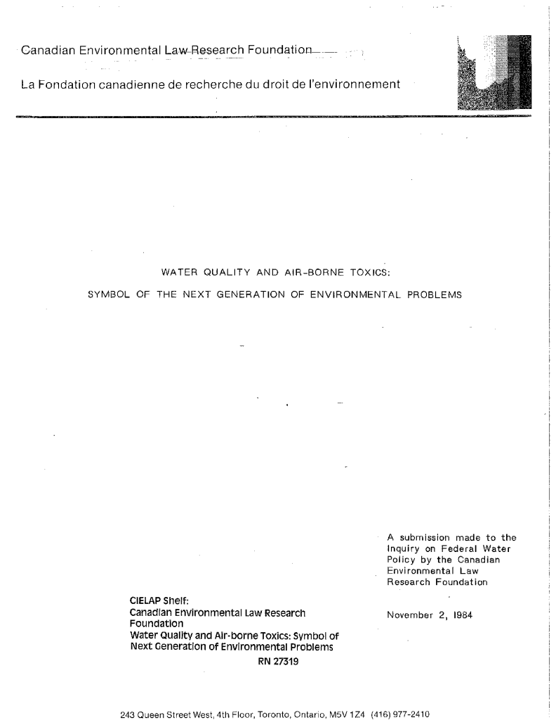 Water quality and air-borne toxics : symbol of the next generation of environmental problems