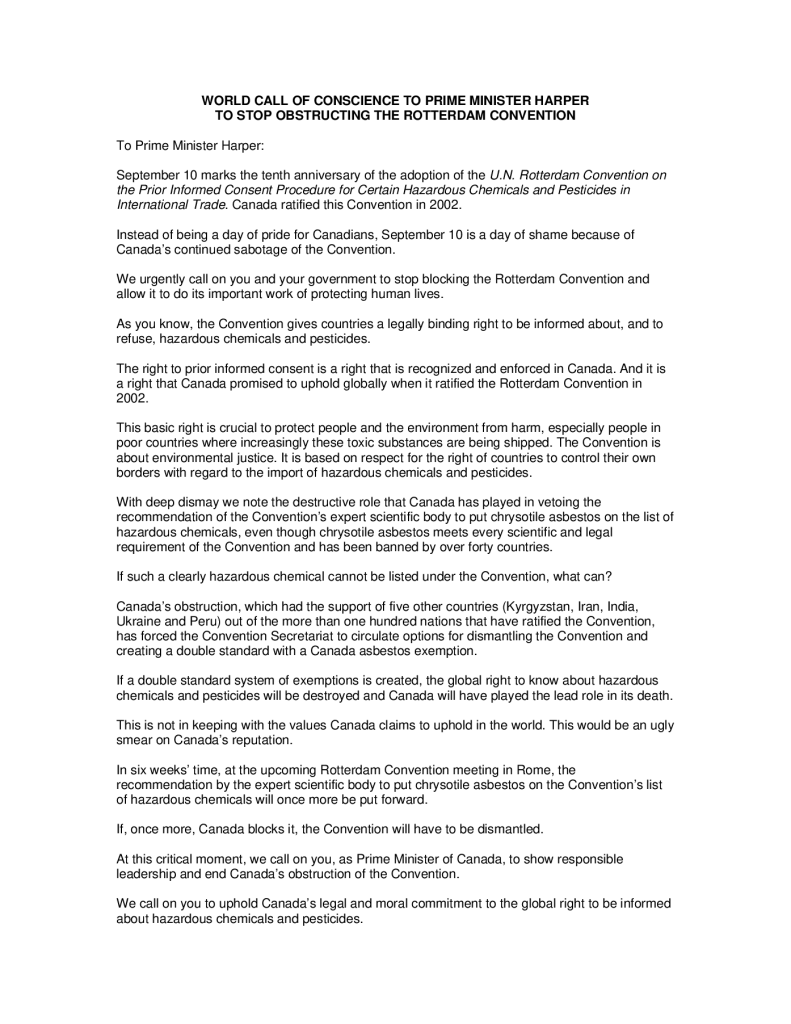 World Call of Conscience to Prime Minister Stephen Harper to Stop Obstructing the Rotterdam Convention (asbestos)